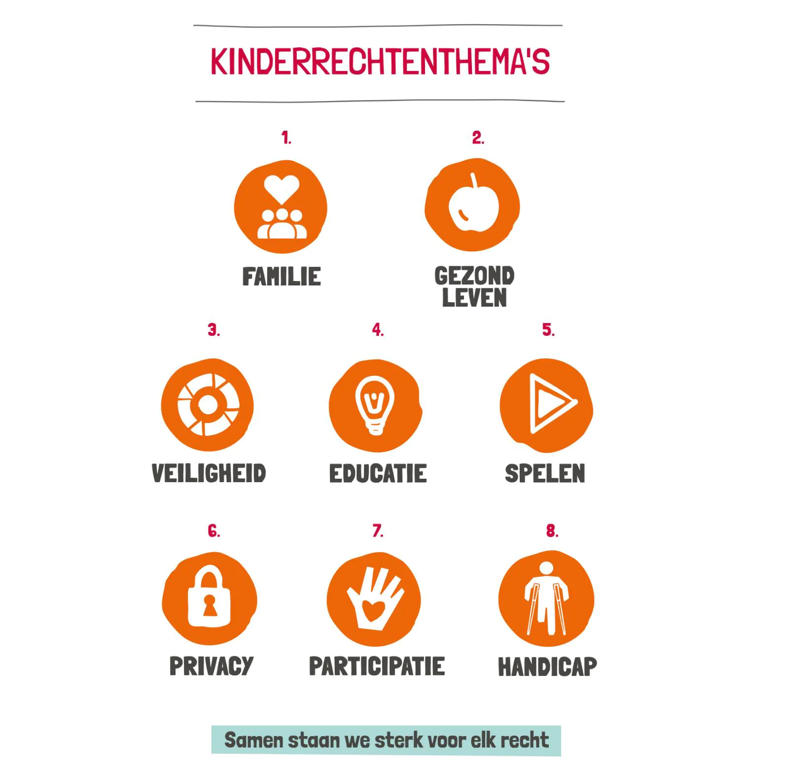 Daarom ontwikkelden we samen een creatief concept: een projectweek rond kinderrechten met als afsluiting een actiedag: het Kinderrechtenfestival. Tijdens dit festival verdiepen kinderen zich spelenderwijs in het Kinderrechtenverdrag. De kinderrechten zijn gekoppeld aan verschillende leerjaren, zodat het programma meegroeit met het kind. Op de actiedag verzamelen de leerlingen stempels via spellen, met als beloning: een eigen festivalbandje.